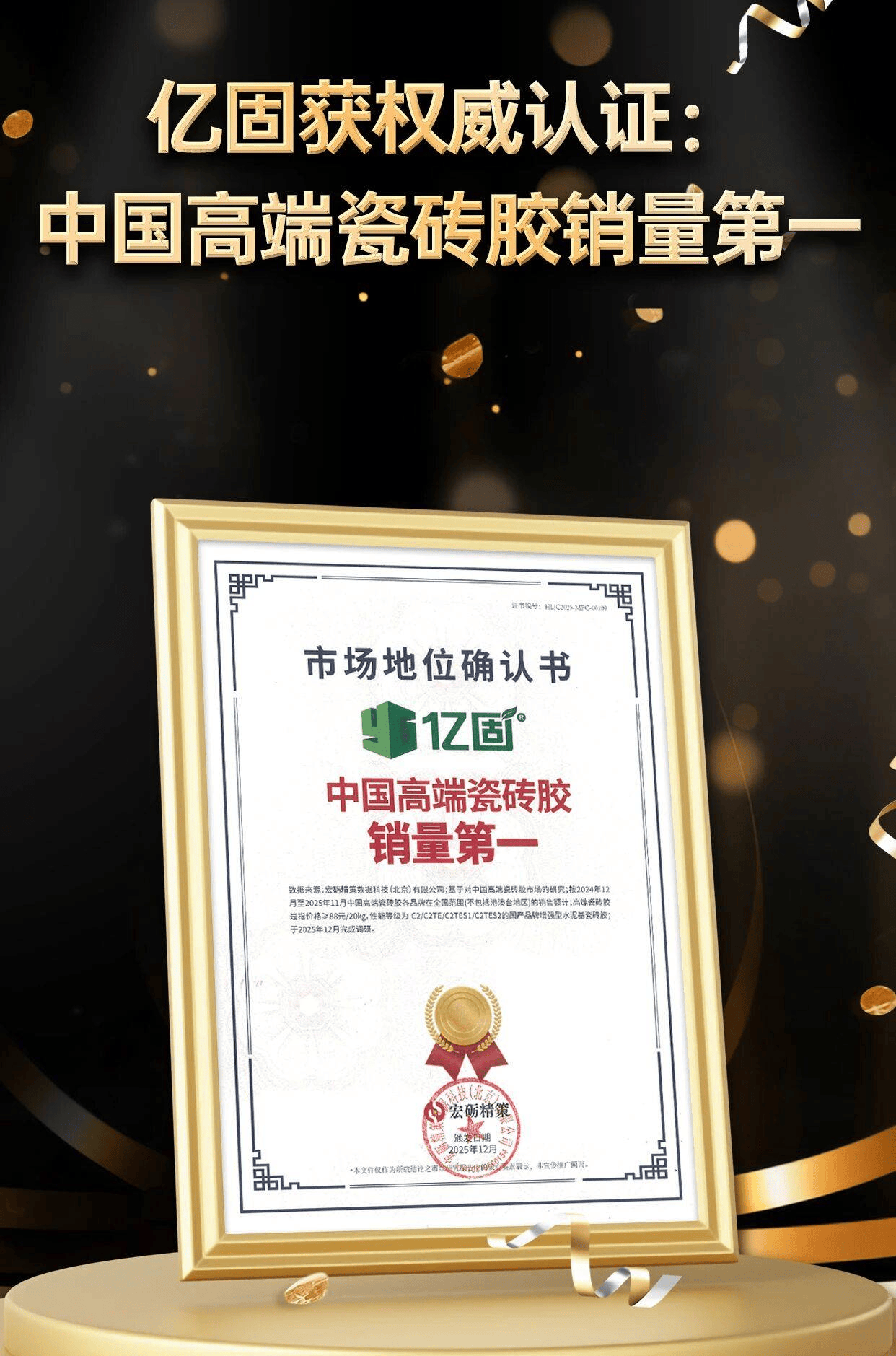 近日,权威市场调查研究机构宏砺精策正式对外发布《市场地位确认书》,明确瓷砖胶十大品牌亿固在统计周期内,以销售额为核心统计指标,成功斩获中国高端瓷砖胶市场国产品牌销量第一的殊荣。该认证基于对全国范围内(不含港澳台地区)、性能等级达到C2及以上的国产品牌增强型水泥基瓷砖胶的全面系统调研,数据覆盖生产、销售、终端应用全链条,具备极高的权威性与公信力。